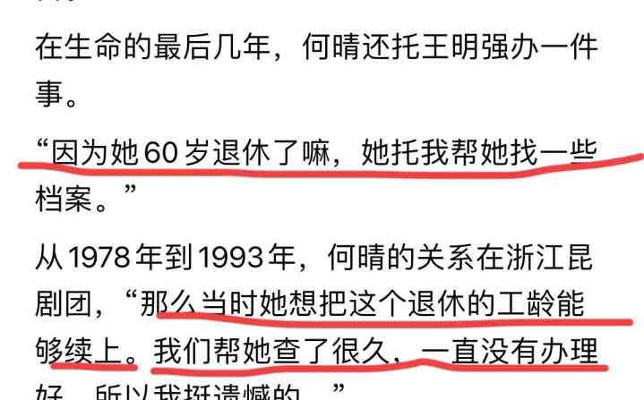 何晴年轻时候进了浙江昆剧团,一待就是十五年。后来她想把那段时间算成工龄办退休,托同事帮忙查了好久也没办成。这事儿一直拖到她生病都没解决,最后就这么走了。要是退休手续能办下来,说不定能少留点遗憾吧。
